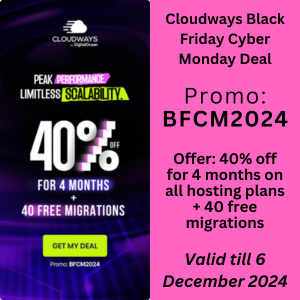 Take advantage of the Cloudways Black Friday Cyber Monday deal and get 40% off for 4 months, along with 40 free migrations. Start building your digital presence today—it’s a step toward amplifying your business in the digital world.